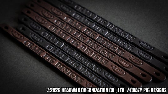 レザーには hide と CRAZY PIG DESIGNS のロゴが深く型押しされ、本作ならではの特別感を演出しています。多くの方に着用いただけるよう、サイズは5種類の長さを用意しました。