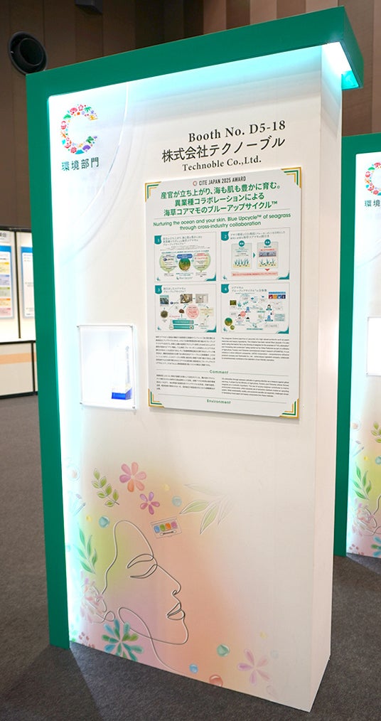今回の展示会では「結MUSUBI」を共通のテーマとし、地域、人、モノなど様々な連携から誕生した美容成分をご紹介させて頂きました。さらにCITE JAPANにおいて選出されるアワードの環境部門において、弊社の取り組みが金賞を受賞致しました。受賞の対象となりましたのは、産官連携による異業種コラボレーションで、海草コアマモを紙資源と美容成分にアップサイクルする、新たなサスティナビリティへの取り組みブルーアップサイクル BLUE UPCYCLE(TM)です。