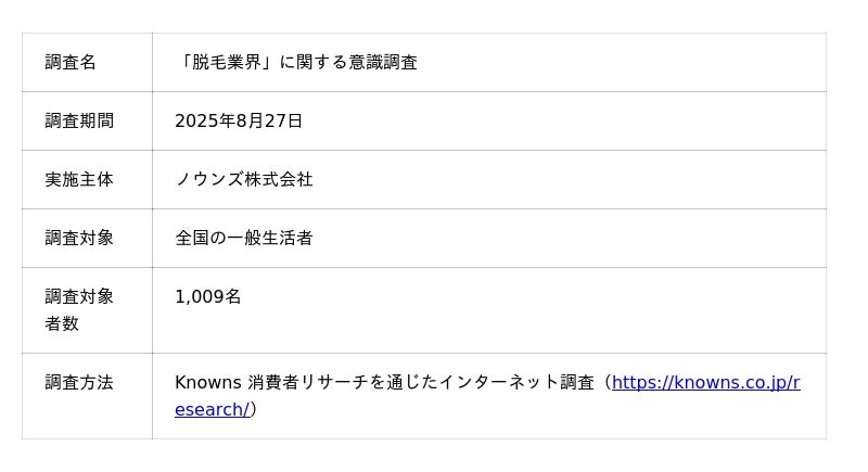 ノウンズ株式会社(本社:東京都渋谷区、代表取締役:田中啓志朗、以下「ノウンズ」)は、同社が提供する消費者意識データをリアルタイムで取得できるサブスク型リサーチSaaS「Knowns 消費者リサーチ」(https://knowns.co.jp/research/)を通じて、全国の一般生活者1,009名を対象に「脱毛業界に関する意識調査」を実施しました(調査期間:2025年8月27日)。