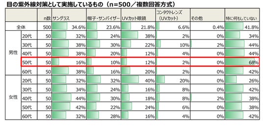 目の紫外線対策として、最も実施率が低かったのは50代男性で68%が何も対策をしていないという結果となりました。