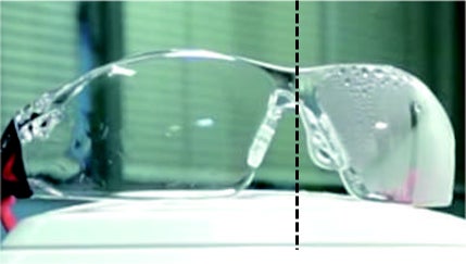 スチーマーによる防曇テスト レンズ左:プラチナコーティング/レンズ右:従来コーティング