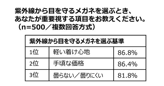 透明で紫外線を99%カットする保護メガネがあったら使いたいですか、という質問に対しては、「ぜひ使いたい」が31.6%、「どちらかというと使いたい」が49.4%と、合わせて81%の方が使ってみたいと考えていることが分かりました。また、紫外線から目を守る眼鏡を選ぶときの基準として、最も多かったのは「軽い着け心地(86.8%)」で、次いで「手頃な価格(86.4%)」、そして「曇らない曇りにくい」が81.8%で第3位にランクインしました。