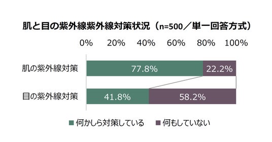 肌の紫外線対策を行っていると回答したのは全体の77.8%で、目の紫外線対策を行っていると回答したのは41.8%という結果となりました。