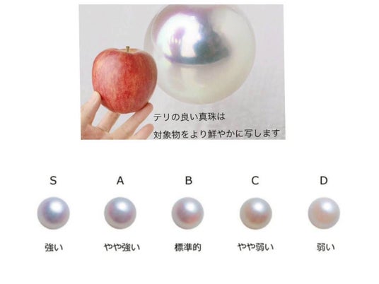 ・ テリ(光沢)が強い黒く反射するような深いテリがある真珠は価値が高い傾向。