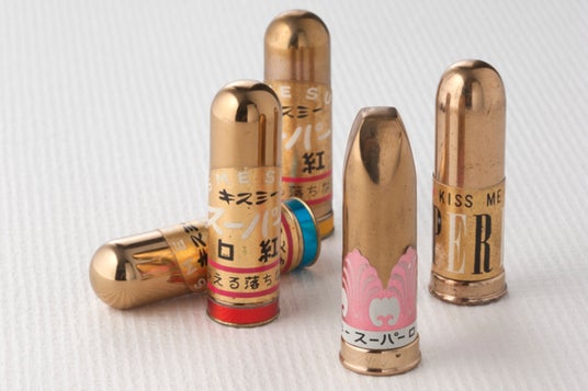 「キスミーシャインリップ」(右から2つめ)1970~2002年 キスミーシャインシリーズは、発売から30年以上に渡り70種類以上の新色・新容器デザインを発表した。
