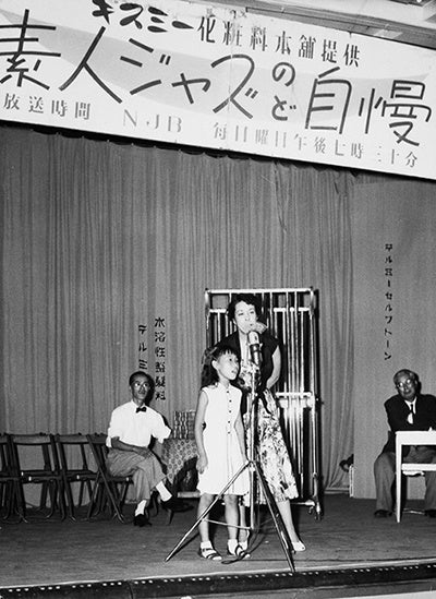 「素人ジャズのど自慢の公開放送風景」1953年~1959年の約5年半、文化放送で続いた聴取者参加型の人気ラジオ番組。キスミー化粧料本舗が1社提供していた。ジャズブームの中、若年層に高い支持を受けた当番組は、化粧品の流行に敏感な層とも合致。ターゲットを意識した宣伝だった。