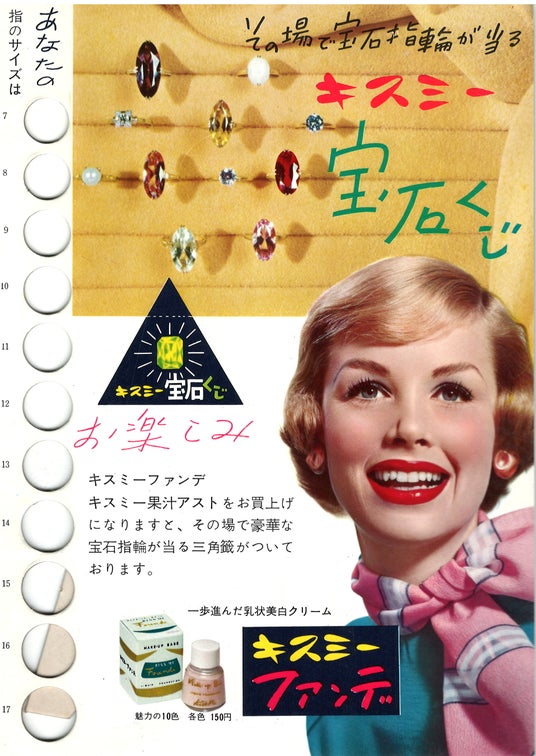 「キスミーファンデ宝石くじPOP」1960年 「キスミーファンデ」と化粧水の「キスミー果汁アスト」のプレゼントキャンペーンのPOP。商品にスピードくじがついており、当たると宝石付きの指輪がその場で貰えるとアピールされた。またくじに外れても、再抽選のダブルチャンスがあった。