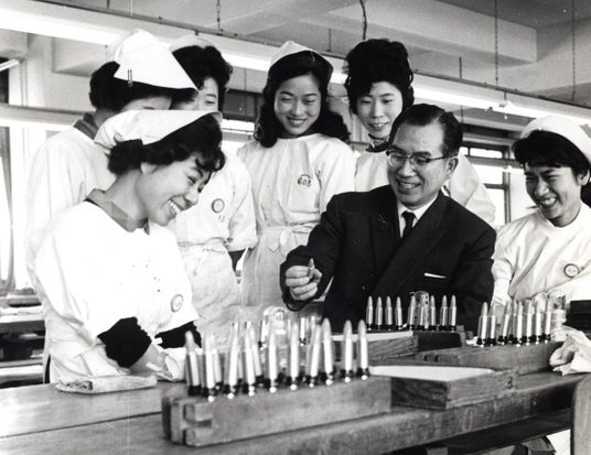 「澤田亀之助と従業員」1964(昭和39)年 口紅を手にして笑顔を見せる。亀之助49歳の頃。