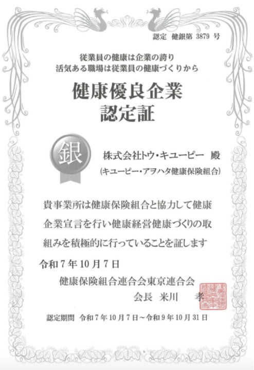 キユーピー株式会社のグループ会社で、キユーピーウエルネスを運営する株式会社トウ・キユーピー(本社:東京都渋谷区、代表取締役社長:谷川和正)は、2025年10月7日付で全国健康保険協会東京支部が実施する「健康企業宣言」において、従業員の健康増進に向けた取り組みが評価され、「健康優良企業 銀の認定」を取得いたしました。