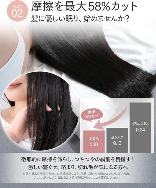 寝返りのたびに起きる「やすり」のような摩擦ダメージから、物理的に髪を守ります。 国内第三者機関による試験の結果、本製品(人工シルク)の平均摩擦係数は驚異の「0.10」を記録。一般的なポリエステル枕と比較して約58%、当社が採用している天然シルクと比較しても約23%もの摩擦削減を実現しました。「天然よりもなめらか」な新素材が、朝まで髪のキューティクルを守り抜きます。 (※比較試験用に購入した市販のコットン、ポリエステル製枕との比較)