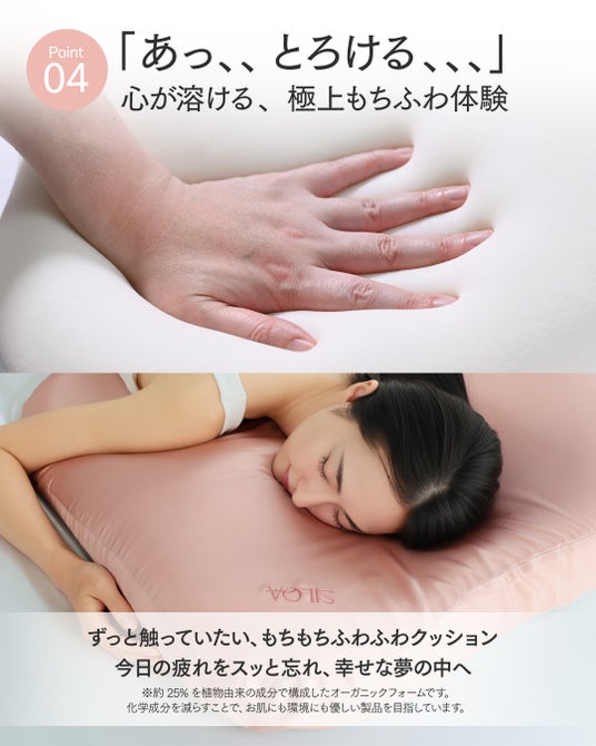首のシワや二重アゴの原因となる「アゴの引きすぎ」を軽減する目的で、一般的な枕より低い5~8cmに設計しました。首筋を自然に伸ばすことで、寝ながら首まわりのエイジングケア(※)を目指します。中材には植物由来のオーガニックフォームを採用し、「とろける」ような柔らかさで、優しく頭を包み込みます。 (※) 年齢に応じたケアのこと