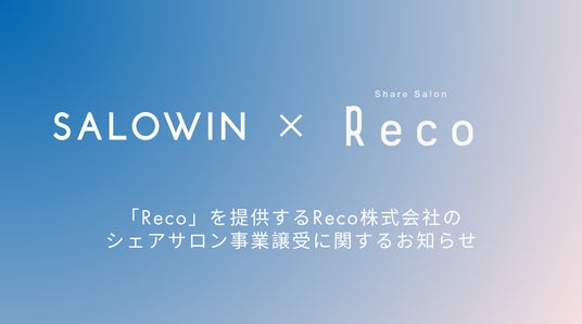 シェアサロン『SALOWIN』『SALOWIN Suite』、ネイル・アイラッシュのシェアサロン『SALON VILLAGE』、サロン開業サービス『ALL SHARE』『me by ,, 』を展開するサロウィン株式会社(本社:東京都渋谷区、代表取締役:阿部 友哉、以下「当社」)は、美容師向け独立支援型シェアサロン「Reco(リコ)」を運営するReco株式会社(以下「Reco」)より、同事業の譲受を行うことを決定し、2025年6月に最終契約を締結いたしましたので、お知らせいたします。