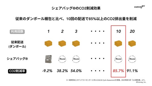 comveyのシェアバッグは、従来のダンボール梱包と比べ、10回の配送で85%以上のCO2排出量を削減することができます。50回~100回程度リユースすることが可能で、使用限度に達した場合はパートナー企業と共にバッグ素材の95%以上を水平リサイクルし、もう一度シェアバッグの材料として活用されます。