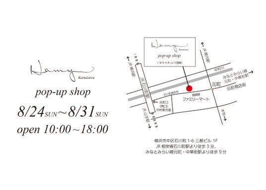 8月24日(日)から8月31日(日)までの8日間、レディースファッションブランド Hamy Karuizawaが、横浜の元町エリアにポップアップショップをオープンします。