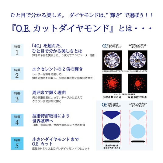 Over Excellent(オーバーエクセレント)は、内面の美しさが溢れ出すO.E.カットダイヤモンドと、それを包みこむ、美しいフォルムが奏でるジュエリーブランドです。めぐり逢いのなかにある、あなただけの愛しいものになるように、そして彩り豊かな時間と共にお届けしております。「O.E.カット」は、ダイヤモンドが持つ美しさを最大限に引き出すために、世界に先駆けて株式会社ほほえみブレインズが開発した新しいカットです。ダイヤモンドがもっとも美しく見える角度を研究し、高度な光学計算により設計され、従来のダイヤモンドに比べ、輝き・きらめき・色づきの効果が大きく向上し比類の無い美しさを実現しました。また、従来最高とされてきたエクセレントカットと同じ58面体でありながら、それを圧倒する輝きを持ちます。ひと目で分かる輝きの美しさにこだわり、周囲まで強く光を放つため、実際のカラット数より大きく見えるような、満足度の高いジュエリーをお届けしております。