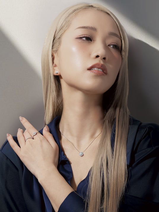 本ビジュアルでは、ブランドを代表するブーケモチーフのエンゲージメントリングを着用。