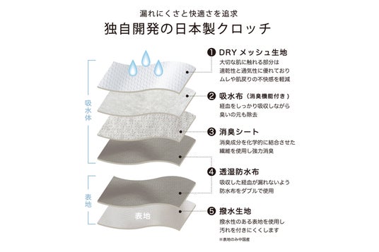 ショーツの吸水体には、厳選した日本製の機能生地を使用し、肌との接触面の快適さ・吸水力・ムレの軽減・消臭力に優れたECRUオリジナルのクロッチを採用しています。