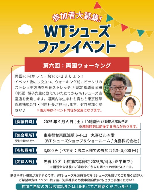 内容:WTシューズを履いて浅草から両国まで歩きます。生まれも育ちも東京浅草、 WTシューズを企画製造している靴メーカー丸喜株式会社の河原勢朗社長が皆様を浅草から両国までご案内します。ご希望の方はウォーキングの最後に両国でちゃんこ鍋を一緒に味わいましょう。