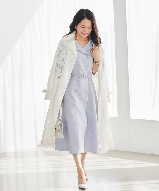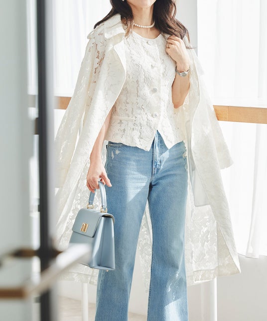 本格トレンチを、贅沢な総レースで仕立てた一着。裏地とボタンを省いたミニマル設計で、軽やかに品よく羽織れるロングコートです。