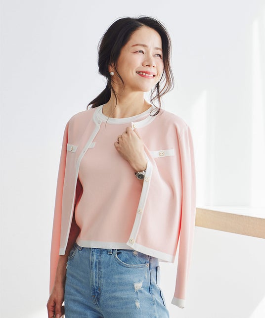 配色トリムと金縁ボタンが映えるニットカーディガン。羽織るだけで「きちんと感」が整い、日常に寄り添う一枚です。