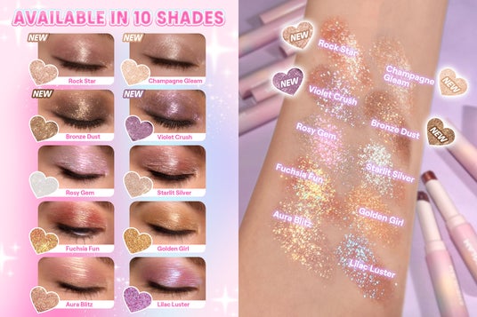 今回登場するのは、ゴージャスなゴールドラメをふんだんに使った落ち着きのあるブラウンカラー「Bronze Dust」、パープルにピンクラメが繊細にきらめく「Violet Crush」、赤みブラウンに華やかなパールを溶け込ませた「Rock Star」、肌になじむシャンパンベージュに上品なツヤをまとった「Champagne Gleam」の全4色。