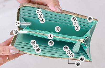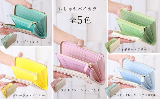 本製品は、一般的な長財布より約3cmスリム化した手のひらサイズのコンパクト設計でありながら、カード・小銭・お札・通帳まで収納できる20ポケット仕様を実現しています。 また、“自分らしさ”を引き出す絶妙なバイカラー展開が魅力で、手に取るたびに気分が上がるデザインとなっています。
