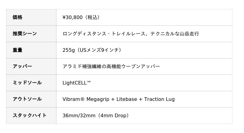 100km以上のウルトラマラソンやステージレースに対応するフラッグシップモデル。LightCELL(TM)超臨界発泡フォームと、生体力学に基づいたミッドソール形状が流れるようなスムーズな足運びをガイド。また、2つのZeroSag(TM)が、超長距離においてもクッション性をキープします。TUNEDFIT(TM) デュアル・レーシングシステムがレース後半の足のむくみにも柔軟に対応し、限界への挑戦を後押しします。