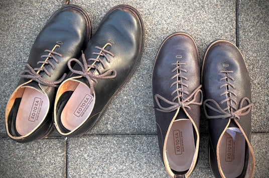 この KOTOKA が、茶芯のブラックレザーを使った靴を2アイテム発売しました。黒い革の中でも「茶芯」と呼ばれるものは革芯が茶色のもの。靴を履き込んでいくと、革肌の黒色が落ちたり褪せたりすることで、革芯の茶色が露出し、これが経年変化の豊かな風合いとなるものです。同じく色落ちなどを楽しむデニム製品などが好きなユーザーを中心に人気が高まっています。