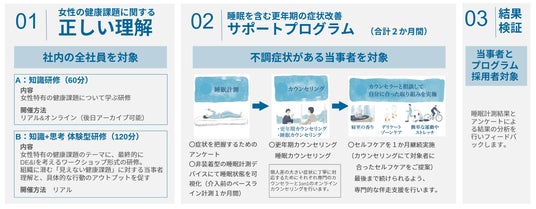 女性従業員の抱える更年期の症状や睡眠などの健康課題に対応するための包括的なサポートプログラムです。女性特有の健康課題に関する基礎知識研修を職場で実施することから始まります。役員や管理職向けにアクティブラーニング型のワークショップ研修も行います。その後、女性当事者向けに睡眠を含む更年期症状改善に取り組む伴走型プログラムを約2か月間実施します。パラマウントベッドの非装着型睡眠計測センサーによる睡眠データの測定や、個別カウンセリング等を通じ、個人の症状や特性に合わせて、睡眠状態等の可視化と改善行動をサポートします。最後に知識研修やプログラム実施の結果を企業にフィードバックします。