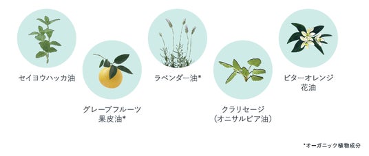セイヨウハッカ油やグレープフルーツ果皮油、ビターオレンジ花油など、こだわりの天然精油を繊細なブレンドで配合しています。