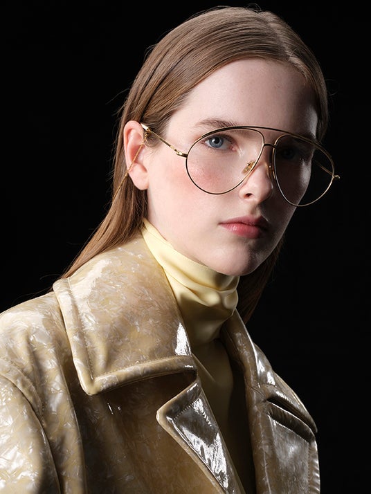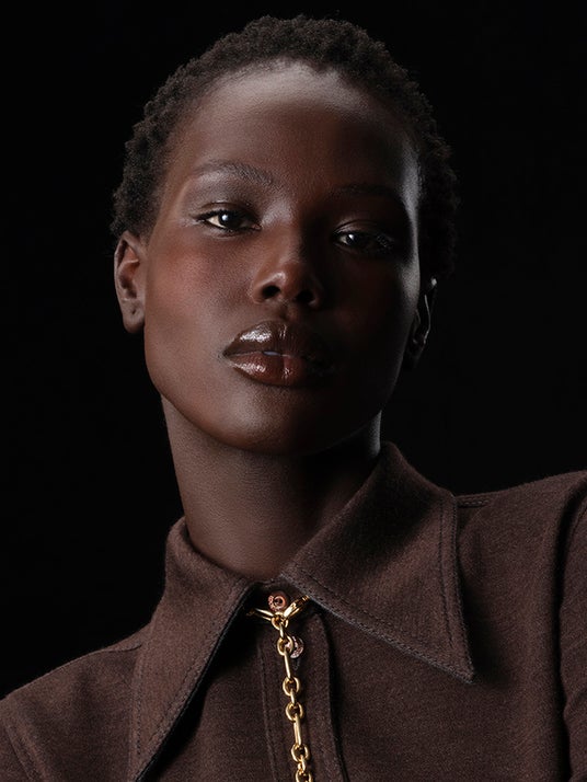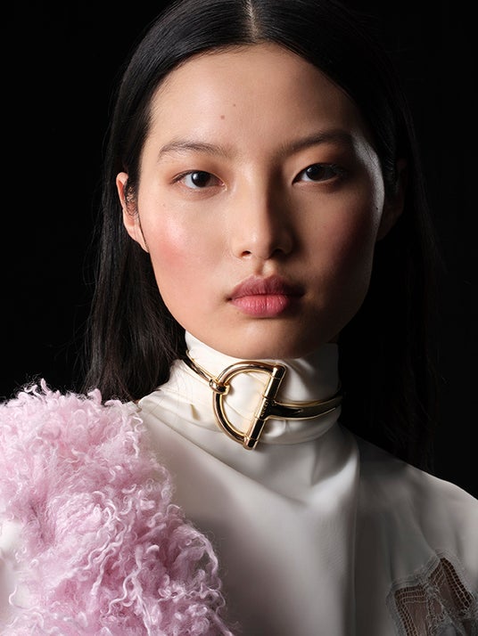 フレッシュで輝く肌は、グッチの最新イルミネーティングパウダー「グッチ グロウ ハイライター」で引き立てられました。このマルチハイライターにより、顔立ちをやわらかく際立たせ、まぶたや鼻先、キューピッドボウ、あご先に繊細な輝きをプラス。また、頬には「グッチ ブラッシュ ドゥ ボーテ」でふんわりとした血色感を与えました。
