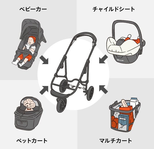 エアバギーのフレームは、上部の「ユニット」を付け替えることで、ベビーカーからペットカート、マルチカートへと自在に変化します。工具不要で誰でも簡単に着脱でき、ライフスタイルの変化にも柔軟に対応可能です。