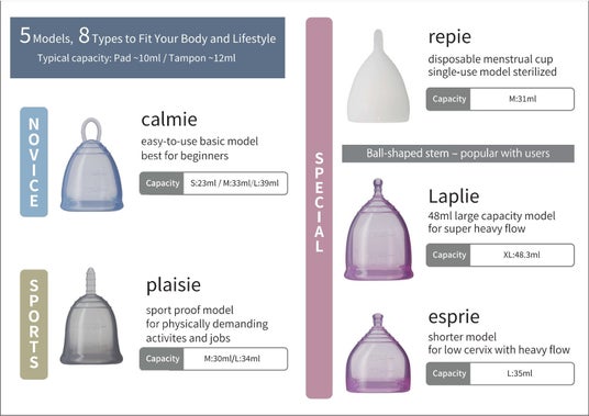 滑らかな表面加工により装着や取り出しがスムーズで快適な使用感を実現。清潔に保管できる専用ケースも付属しています。サイズやモデルは全8種類を展開し、使用者の体型や経血量、ライフスタイルに合わせた選択が可能です。