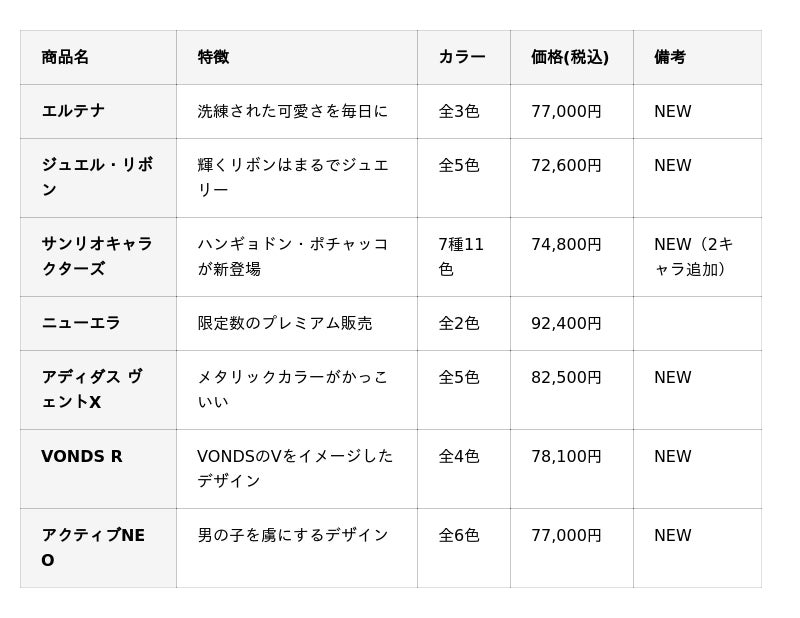 今年度は、オーダーメイドランドセルの新色・新デザインパーツの追加により、組み合わせが530億通り以上に拡大。さらに、コレクション(既製品)ラインでは「エルテナ」「ジュエル・リボン」「VONDS R」「アクティブNEO」など注目の新モデルが多数登場します。加えて、サンリオキャラクターズやアディダスランドセルの新作「ヴェント X」も新たにラインナップ。お子さまの個性と好みに合わせた、世界にたった1つのランドセル選びをお楽しみいただけます。