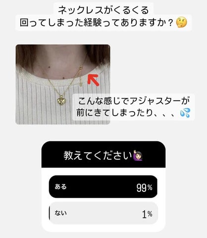 回答してくれた99%の方が、ネックレスが回ってしまった経験があるようです。みなさん、普通に着用して生活しているだけなのに回ってしまう…と悩んでいるようでした…!