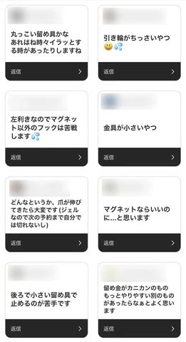 とくに小さいものや、丸いタイプの留め具は、上手くつけられないという人が多くいました。中には爪が長くなると、留め具を開閉するのも苦労するという声も…!