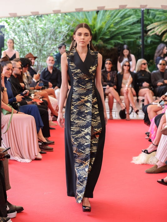 カンヌ映画祭期間中に開催されたファッションショーより。国際的なゲストが集う舞台で、日本の伝統美・西陣織によるラグジュアリーフォーマルドレスを披露。