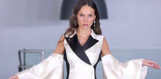 パリ・ファッションウィークにて発表された「Maison MUNETAKA YOKOYAMA」最新コレクション。日本の伝統美と現代的フォーマルを融合した象徴的なルック。