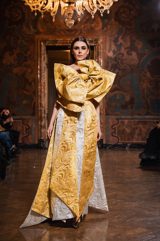 2025年、パリにて発表された「Maison MUNETAKA YOKOYAMA」コレクション。西陣織をはじめとする日本の伝統素材と、現代的なフォーマルシルエットを融合し、多様な個性を纏うラグジュアリーフォーマルの世界観を体現したフィナーレ。