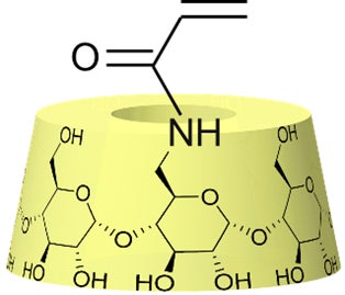 CDTSをキーマテリアルとして、トシル基を起点とした化学変換(複数の合成操作)により、容易に高分子(ポリマー)の化学構造に組み込みやすい、β-シクロデキストリン-6-アクリルアミド(以下、CDAA 図4)を合成し、ました。現在に至っては切断傷に対応した自己修復性をもつ素材、「ウィザードゲル(R)」に利用しています。