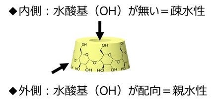 なお、CDは立体的に円を描くような構造を持ち、中は空洞で、他の化合物を取り込むことができます。特に、環の内側が疎水性で、外側が真逆の親水性であるため、特に水中では、疎水性の化合物を取り込む特徴があります。(図3)