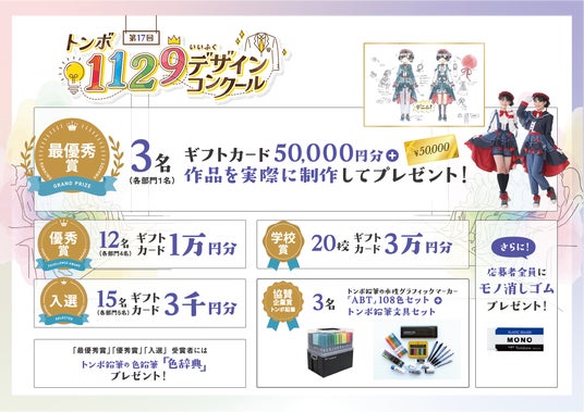 また、前回に引き続き、同じ「トンボ」の社名の文房具メーカー、株式会社トンボ鉛筆(本社:東京都北区)様とコラボレーションいたします。「学校生活がより素晴らしいものになるように」との共通の願いを込め、本年度も協賛企業賞『トンボ鉛筆賞』を設置。副賞として同社製品をご提供いただくなど、強力なバックアップをいただいております。