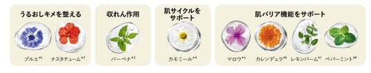 *¹ヤグルマギク花エキス *²ノウゼンハレン花/葉/茎エキス *³ボウシュウボク葉エキス(収れん成分)*⁴カミツレ花/葉/茎エキス *⁵ゼニアオイ花/葉/茎エキス *⁶トウキンセンカ花エキス *⁷メリッサエキス *⁸セイヨウハッカ葉エキス *⁹イヌリン、フルクトオリゴ糖 (*¹、*²、*⁴~*⁹ 全て頭皮コンディショニング成分) *¹⁰角層まで