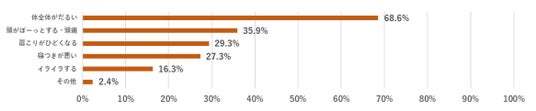 寒暖差疲労の具体的な症状を聞いた設問では、「体全体がだるい」(68.6%)、「頭がぼーっとする・頭痛」(35.9%)、「肩こりがひどくなる」(29.3%)、「寝つきが悪い」(27.3%)など日々の生活や仕事に影響を及ぼす慢性的な体の不調感を感じている人も見受けられました。その他、「鼻づまり」や「くしゃみ」など「風邪」の症状とも関連している可能性が考えられます。