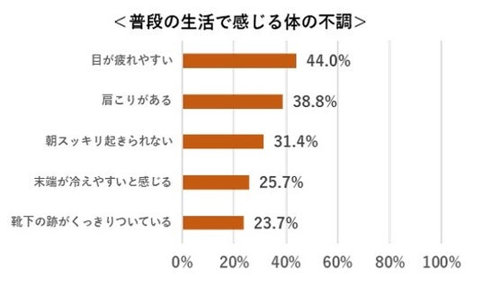 また、症状の項目では「目が疲れやすい」(44.0%)、「肩こりがある」(38.8%)、「朝スッキリ起きられない」(31.4%)などの兆候が多く見られました。血液には、全身の老廃物や疲労物質を回収し、体の隅々まで酸素や栄養を運ぶ役割があります。血流が滞ることでこれらの働きが鈍くなり、痛みや筋肉のこわばりといった目の疲れや肩こりの原因となる症状につながりやすくなるのです。