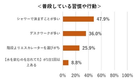 調査では、約4割が3項目以上当てはまる「寒暖差疲労予備軍」である結果となりました。また、2項目以上当てはまった人は約6割と、半数以上が「寒暖差疲労予備軍」一歩手前の血流に注意が必要な状況であるという課題も見えました。原因となり得る日常の習慣で最も多かったのが「シャワーで済ますことが多い」(47.9%)、次いで「デスクワークが多い」(36.0%)、「階段よりエスカレーターを選びがち」(25.9%)となりました。現代のライフスタイルにおいては、湯船入浴の機会が少ない、同じ姿勢で長時間いるなど、血流が滞りやすい習慣も多く、特に寒暖差が激しくなる時期には注意が必要といえます。