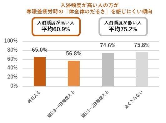 炭酸浴を含む入浴は、血流促進の効果を高める手軽な方法です。湯船につかり、全身を温めることで、血流が促進されます。今回の調査でも、入浴頻度が低い人(週に1~2日程度入る/全く入らない)は、入浴頻度が高い人(毎日入る/週に3~6日程度入る)に比べて約1.2倍“だるさ”を感じていました。つまり、入浴頻度の高い人の方が寒暖差疲労の症状で最も多かった「体全体がだるい」を感じにくいことがわかりました。
