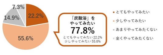 また、寒暖差疲労への対策として「効果的に血流促進できる「炭酸浴」を生活に取り入れたいか」という設問をしたところ、普段から寒暖差疲労を感じている人の約8割(77.8%)が「やってみたい」と回答。手軽な寒暖差疲労のための血流の改善習慣として生活に取り入れたい意向があるといえます。