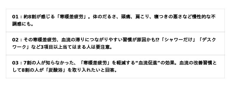 <TOPIC 03>7割の人が知らなかった、「寒暖差疲労」を軽減する“血流促進”の効果。血流の改善習慣として8割の人が「炭酸浴」を取り入れたいと回答。