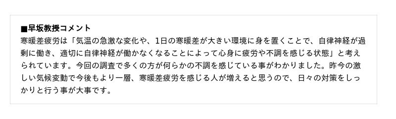 多くの人が秋から冬へ季節が変わるタイミング(10月後半頃)で寒暖差を感じており、「寒暖差のある日に疲労感を感じる」(「寒暖差疲労」の)人がそのうち約8割(76.8%)を占める結果となりました。